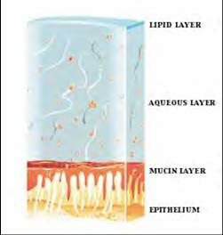 The aqueous layer of the tear film is produced by the lacrimal glands (in the upper eyelids). This is the thick middle layer of the tear film. The mucin layer underneath helps it adhere to the epithelium and the lipid layer on top protects it from rapid evaporation.