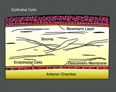 Except in the very most severe cases of dry eye where more of the corneal tissue may become compromised, the corneal epithelium is the part of the eye we dry eye patients care about most. It is disruption to the proper lubrication and adherence of tear film to the epithelium which causes dry eye symptoms. Sometimes anatomical defects in the epithelium itself (see ABMD) may also play a role.