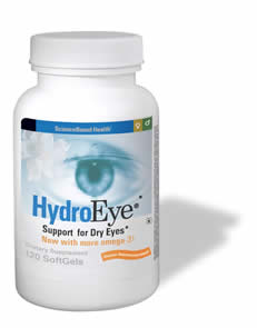 From Science Based Health: "HydroEye is a patented oral formulation that provides continuous relief for dry eye discomfort. HydroEye contains a proprietary blend of omega-3 and omega-6 fatty acids, antioxidants, and other key nutrients that work together to support a healthy tear film."