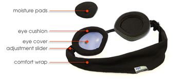The eye covers are made of soft, flexible rubber. Around the inside perimeter of each eye cover is an eye cushion, made of a soft foam. This foam may be lined with fabric or plain (both types of foam are available in the replacement sets). In the middle of each eye cover is a removeable moisture pad which may be used wet or dry; to use it wet you would wet it with distilled water, squeeze out the excess and place it in the goggle before putting the goggle on. The comfort wrap is a soft fabric strap that keeps it in place and which can be adjusted with the adjustment sliders at the sides.
