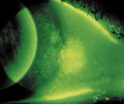In testing for TBUT, sodium fluorescein dye is added to the eye and the tear film is observed under the slit lamp while the patient avoids blinking until tiny dry spots develop. The longer it takes, the more stable the tear film. A short tear break-up time is a sign of a poor tear film. Generally, >10 seconds is thought to be normal, 5 to 10 seconds, marginal, and <5 seconds low (with high likelihood of dry eye symptoms).